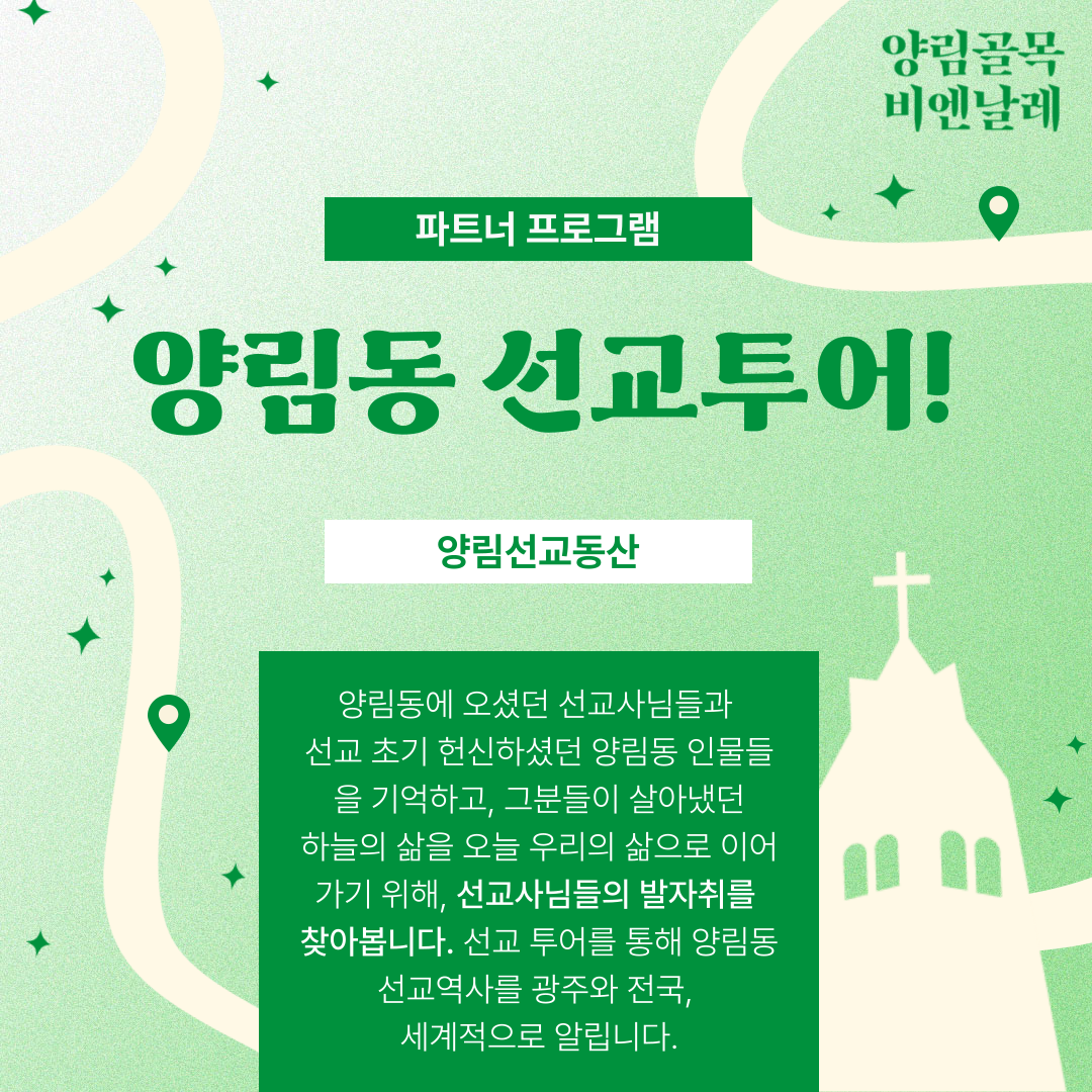 양림동에 오셨던 선교사님들과 선교 초기 헌신하셨던 양림동 인물들을 기억하고, 그분들이 살아냈던 하늘의 삶을 오늘 우리의 삶으로 이어가기 위해, 선교사님들의 발자취를 찾아봅니다. 선교 투어를 통해 양림동 선교역사를 광주와 전국, 세계적으로 알립니다.