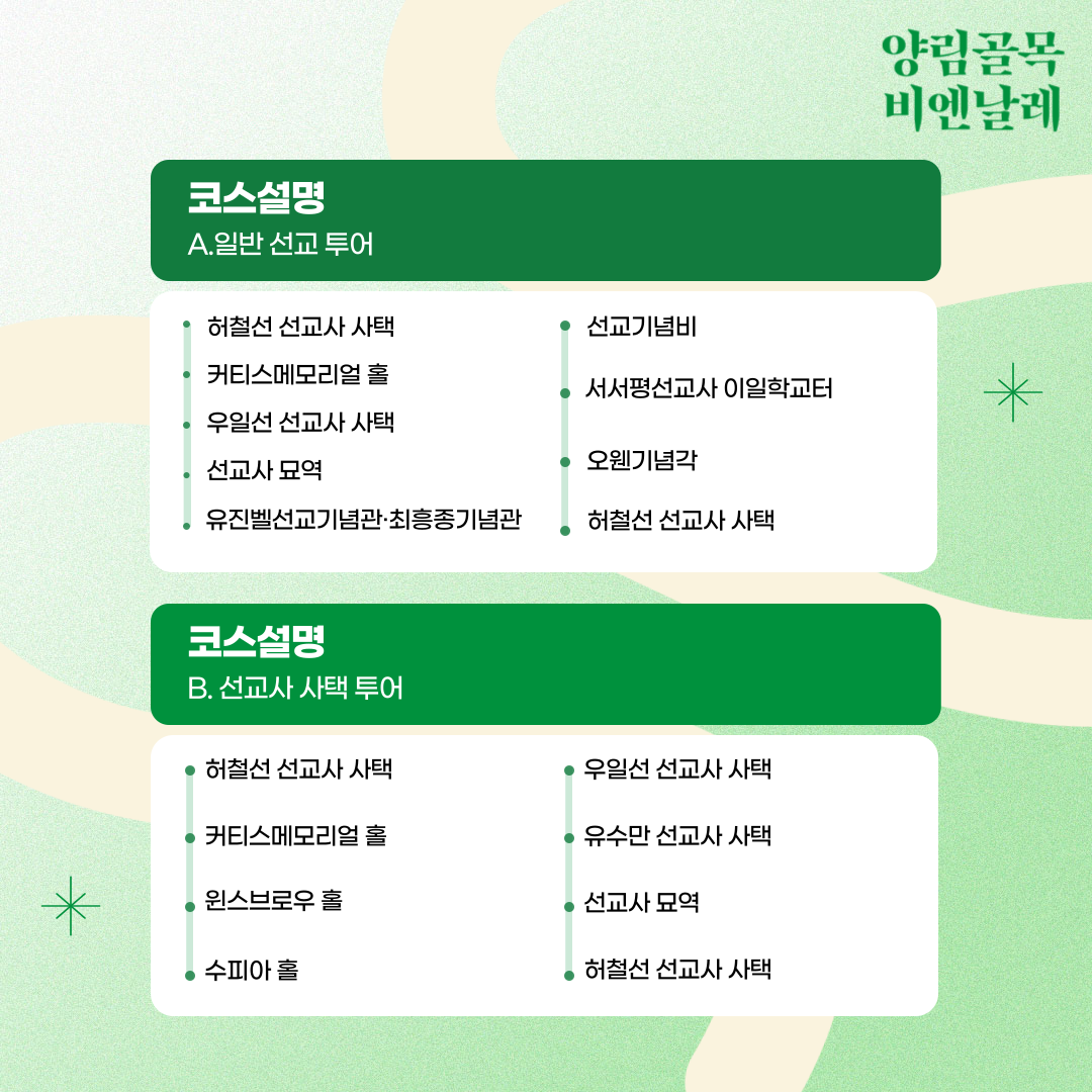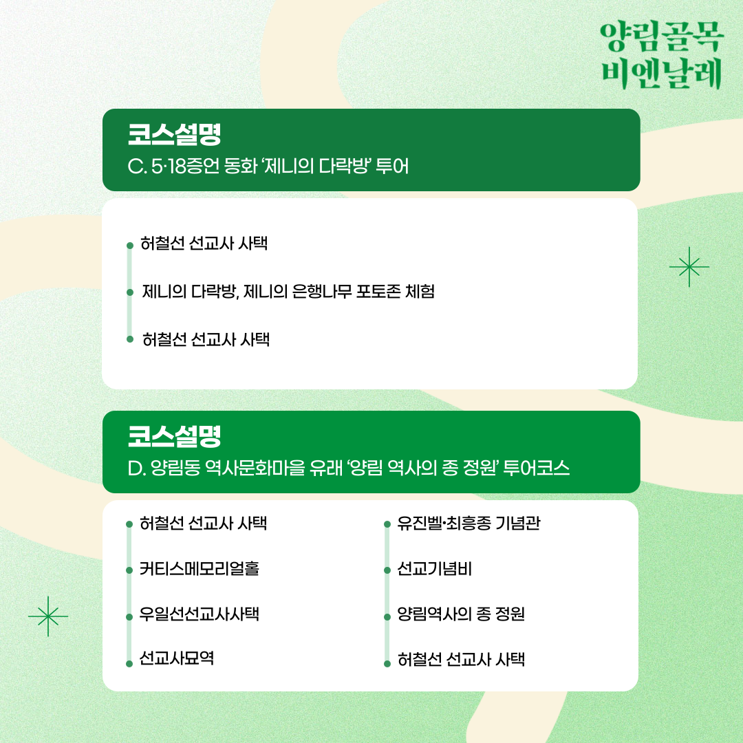 코스소개 : (1) 일반 선교 투어 / (2) 선교사 사택 투어 / (3) 5·18증언 동화 '제니의 다락방'투어 / (4) 양림동 역사문화마을 유래 '양림 역사의 종 정원' 투어